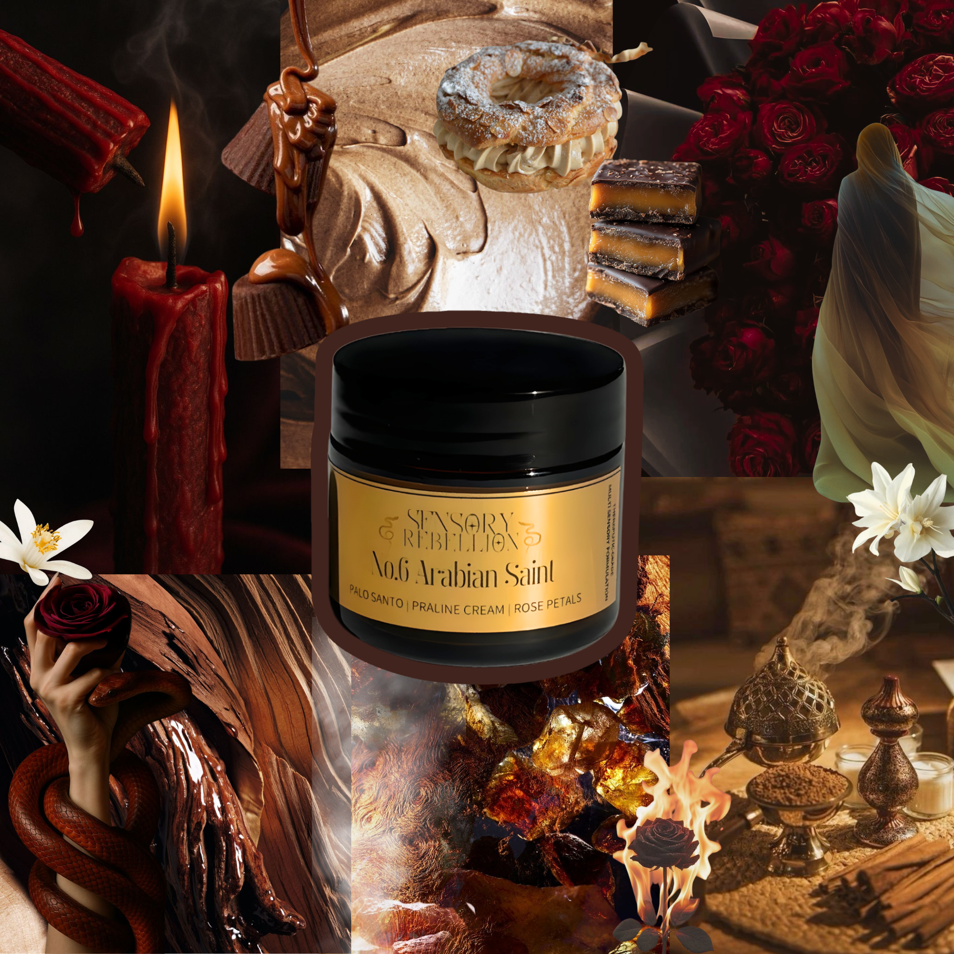 Palo santo and rose petals drift through clouds of praline cream, leaving behind the scent of warmth and sacred indulgence. Deep, woody, and hypnotic, it feels like incense curling through a velvet room. Luxurious, grounded, and divinely sensual. This is calm turned into ceremony.